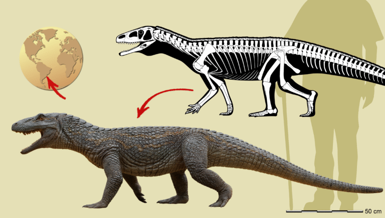 During the Triassic (252 million to 201 million years ago), Archosaurs dominated the world of land-based vertebrates — the name means “ruling reptiles” — and is split into two main groups. One group, Ornithosuchia, evolved into birds and dinosaurs, while the other, Pseudosuchia, gave rise to crocodilians, such as modern crocodiles.