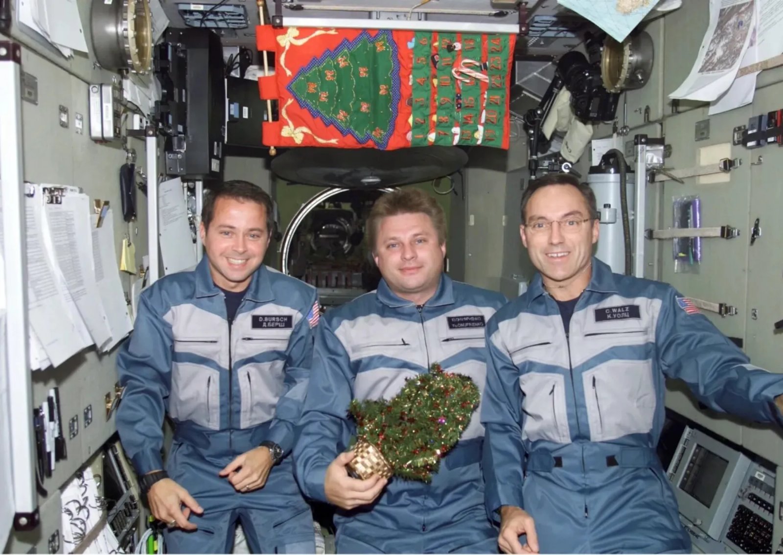 Expedition 4 crew members, former NASA astronauts Daniel Bursch and Carl Walz, along with Rosocosmos cosmonaut Yuri Onifriyenko, pose for a Christmas photo in December 2022. Image: NASA. Expedition 13 crew members, Rosocosmos cosmonaut Valery I. Tokarav (left) and former NASA astronaut William McArthur, pose with Christmas stockings in December 2005. Image: NASA. The six Expedition 30 crew members assembled in the U.S. Destiny laboratory aboard the space station for a Christmas celebration in December 2011. Image: NASA. ESA astronaut Samantha Cristoforetti pictured above the space station on December 20, 2014 during Expedition 42. Image NASA. Expedition 50 crew members celebrate the holidays aboard the orbiting laboratory in December 2016. Image: NASA. Four Expedition 70 crewmates join each other inside the space station and join each other inside the space station’s Unity module for a Christmas Day Meal in December 2023. From left are Flight Engineer Koichi Wakata from JAXA (Japan Aerospace Exploration Agency); Commander Andreas Mogensen from ESA (European Space Agency); and NASA Flight Engineers Loral O’Hara and Jasmin Moghbeli. Image: NASA. NASA astronaut and Expedition 72 Commander Suni Williams shows off a holiday decoration of a familiar reindeer aboard the ISS on December 16, 2024. The Decoration was crafted with excess hardware, cargo bags, and recently-delivered Santa Hats. Image: NASA. NASA astronauts Expedition 72 Flight Engineer Don Petit (left) and Commander Suni Williams (right) pose for a fun holiday season portrait while speaking on a ham radio inside the space station’s Columbus laboratory module. Image: NASA.