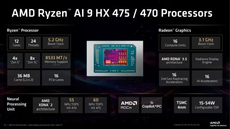 Let’s start with the Ryzen AI 400 series. Officially the follow-up to the Ryzen AI 300 chips announced in June 2024, these processors offer some modest clock speed improvements and faster memory support. The new Ryzen AI 9 HX 470 has a peak boost clock speed of 5.2 GHz and support for LPDDR5x-8533, for example, up from 5.1 GHz and LPDDR5x-8000 for the Ryzen AI 9 HX 370, and its built-in neural processing unit (NPU) is capable of 60 trillion operations per second (TOPS) rather than 50 TOPS.