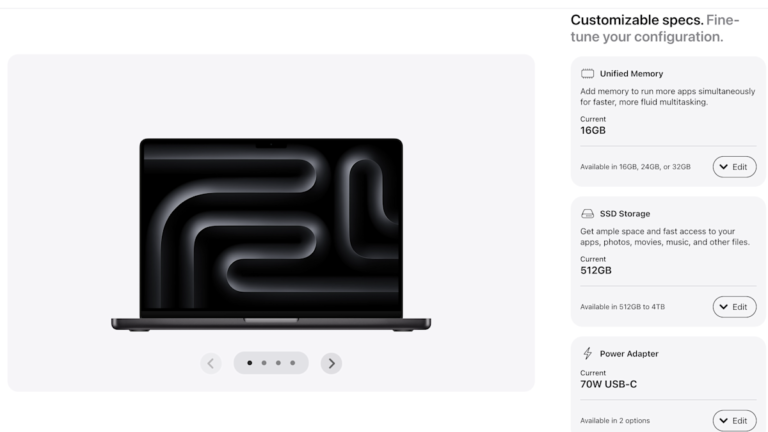 It’s not a major difference compared to choosing between preconfigured options, but interested buyers have more customization since they can select the color, display, chip, memory, storage and even power adapter. The updated page also gives customers the option to add pre-installed apps, like Final Cut Pro or Logic Pro, to their new Mac.