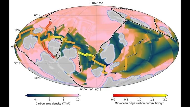 “The breakup of Nuna created a lot of new ocean floor in young ocean basins that previously did not exist,” Müller explained. And this ocean floor contributed to the decline of atmospheric CO2 already triggered by the shortening of subduction zones, he said. That’s because when seawater seeps into cracks in the seabed, carbon gets stripped out to make limestone.