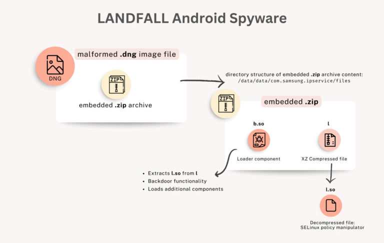 Before the April 2025 patch, Samsung phones had a vulnerability in their image processing library. This is a zero-click attack because the user doesn’t need to launch anything. When the system processes the malicious image for display, it extracts shared object library files from the ZIP to run the Landfall spyware. The payload also modifies the device’s SELinux policy to give Landfall expanded permissions and access to data.