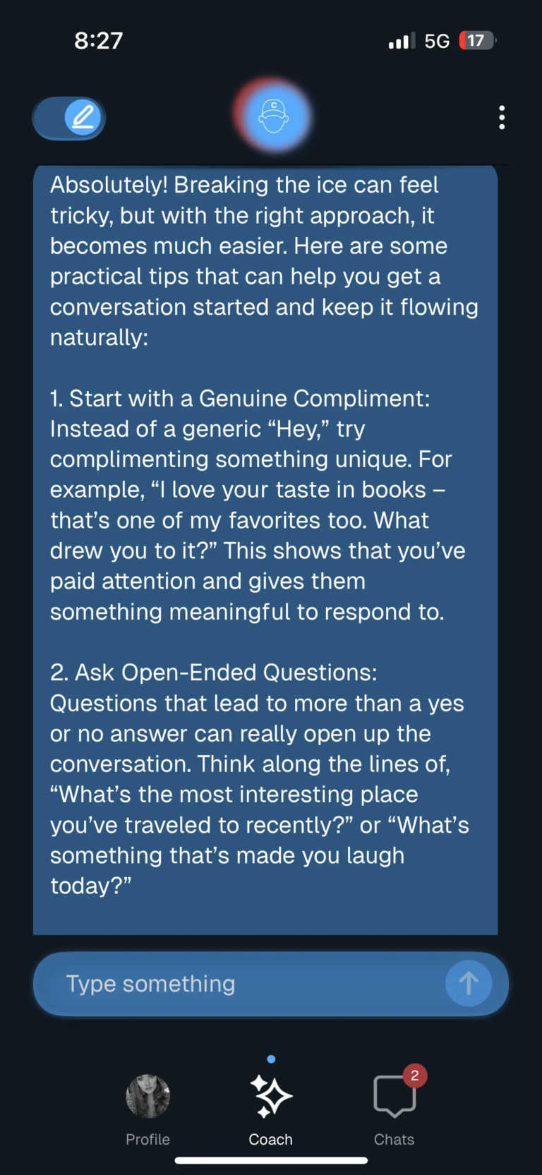 I asked it to give me tips on how to break the ice with new matches, and it gave me advice, with each point having an explanatory paragraph below. Advice included giving compliments, asking open-ended questions, using humor, referencing current events, sharing about yourself, and mentioning mutual interests. The advice was basic but solid, and mirrored what the coach was doing with the provided conversation prompts.