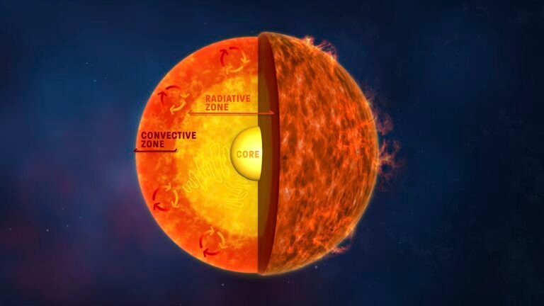 In that same region, the sun’s rotation rate also varies by depth, Hoeksema said. Even deeper in the sun, the radiative zone — which lies between the convection zone and the sun’s core — rotates like a solid, at a rate of about 26.6 days, regardless of the latitude.