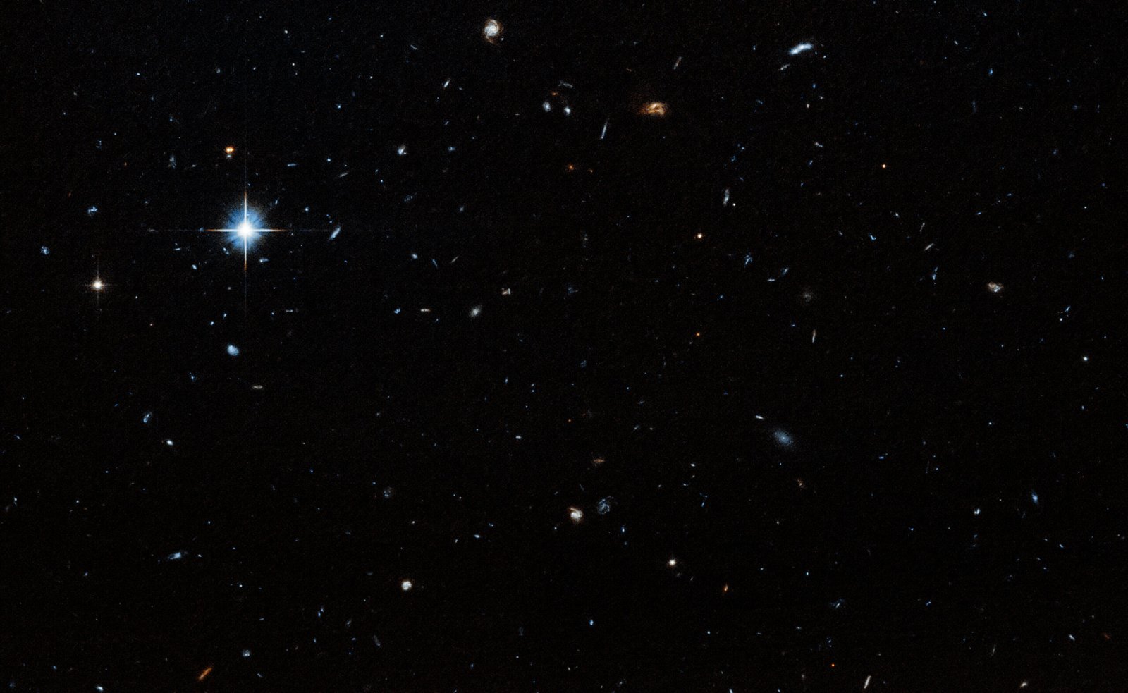 A dark field with stars and galaxies of various sizes speckled throughout the image. A particularly bright star is visible in the upper left region of the image.