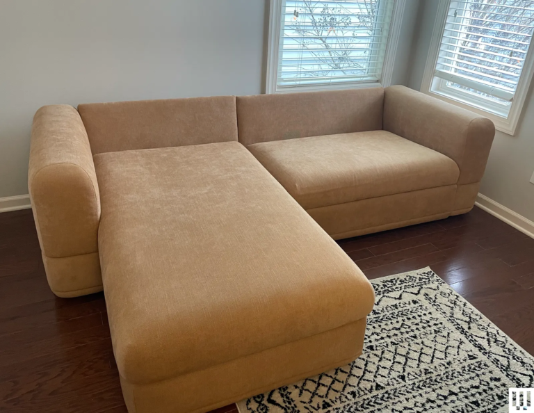 In honor of all my previous sleeper sofa experiences, I wanted to know how the Wanda would fare in a small room. So instead of my usual spacious studio setup, with dimensions of 13 feet by 15 feet, I decided to use my upstairs home office. Since I didn’t move my desk out of the way, the Wanda took up half the room, which was only 10.5 feet by 10.5 feet, give or take, with other furniture in it. The sofa bed is 99 inches long (8.25 feet) and resembles a sideways “L,” with the chaise jutting out 69 inches (5.75 feet). As if this weren’t cozy enough, my husband and two small dogs decided to set up shop with me.