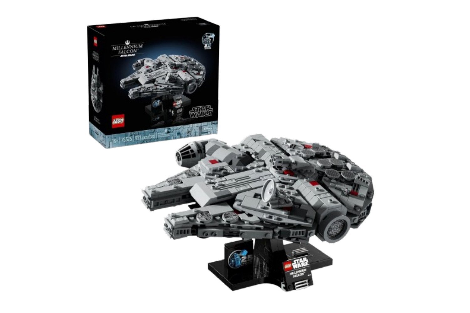 This collectible build-and-display model lets you build a mid-scale brick recreation of one of the most iconic ships, and comes with 921 pieces in total. It hits that sweet spot; not too massive, but not so simple that you’re done before you’ve even settled in. LEGO packs it with details like the cockpit, satellite dish, and dual cannons. Even better, there’s a buildable stand to place the ship on. It includes a nameplate and a special 25th Anniversary LEGO Star Wars brick. You can even position the Falcon at a dynamic angle for a more realistic, mid-flight look.