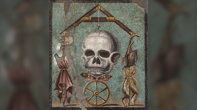 “The mosaic’s subject represents a warning to the homeowner,” according to a translated explanation in Italian from the museum. “One can be rich or poor, but in the end, facing death, we will all be equal.”