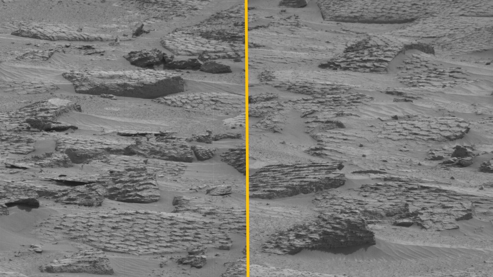 A pair of black-and-white photos of the “scales” was released by NASA April 14, while a close-up color image of the rocks was shared online the next day by Kevin M. Gill, a software and spaceflight engineer at NASA’s Jet Propulsion Laboratory (JPL) who specializes in image processing. (The pics were captured April 7 and April 13, respectively — also called Sol 4859 and Sol 4865 in Martian time.)