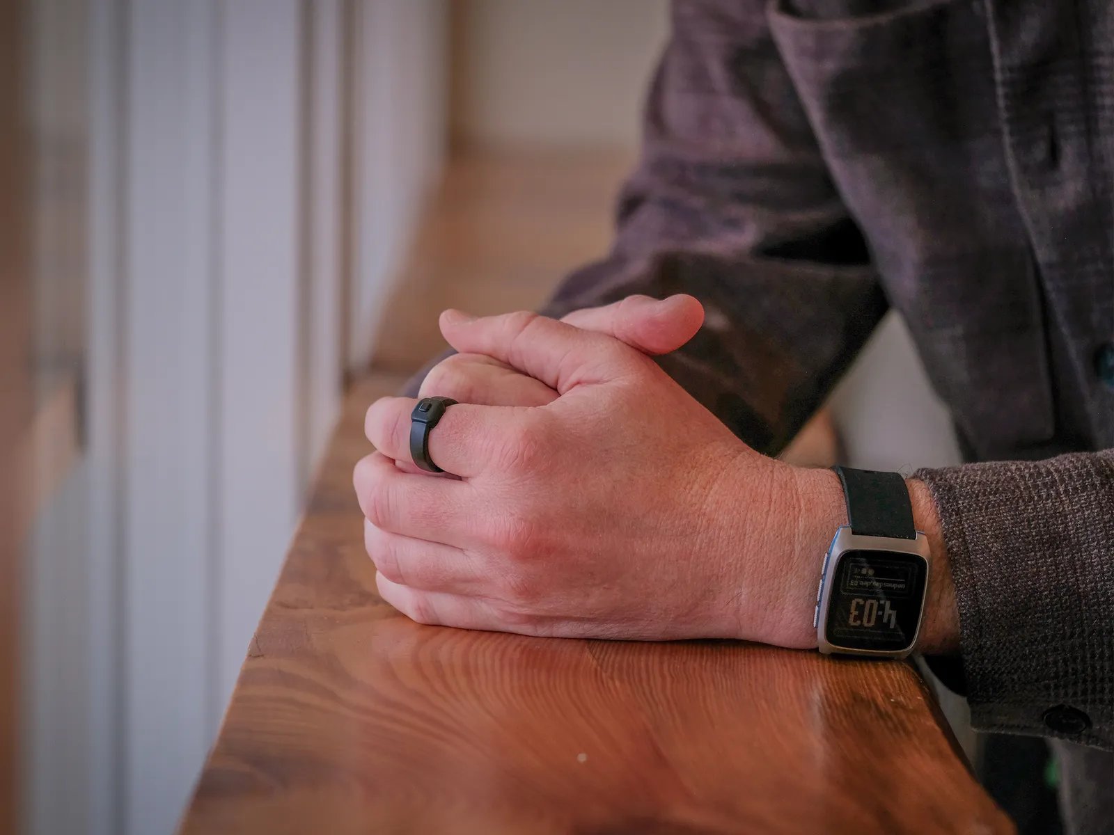 Closeup of a person's hands clasped together showing a Pebble ring on one finger