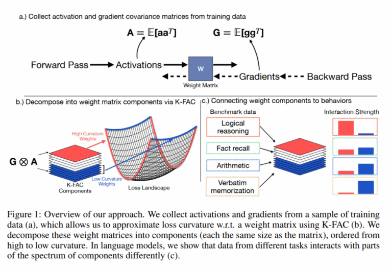 Using a technique called K-FAC (Kronecker-Factored Approximate Curvature), they found that individual memorized facts create sharp spikes in this landscape, but because each memorized item spikes in a different direction, when averaged together they create a flat profile. Meanwhile, reasoning abilities that many different inputs rely on maintain consistent moderate curves across the landscape, like rolling hills that remain roughly the same shape regardless of the direction from which you approach them.