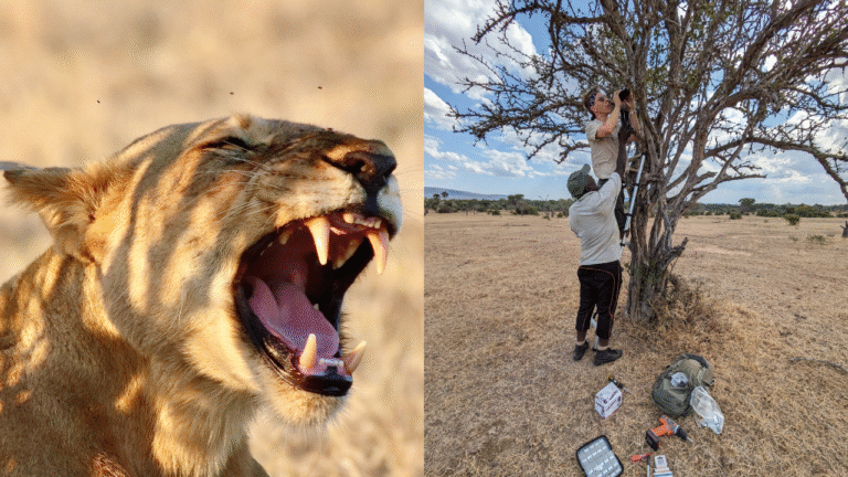 Collage with two photos; on the left we see a female lion roaring and on the right we see two men installing a microphone in a tree.