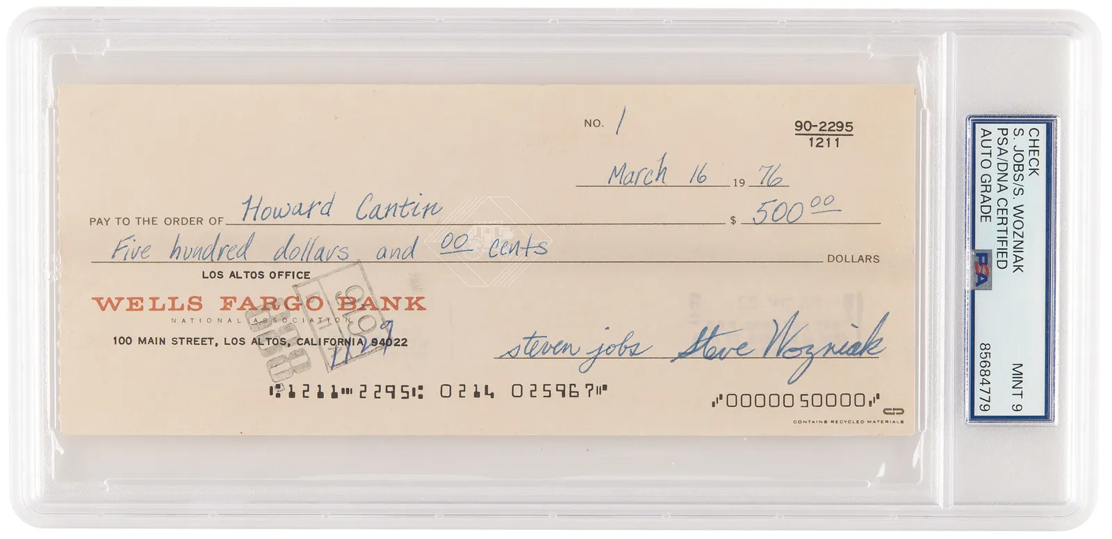 Items relating to early Apple history, especially items that involve Jobs, have gone to stratospheric prices in recent years. Jobs was famously reluctant to sign items, and his signature is regarded as among the most valuable of any public figure. Even a signed business card can go for as much as six figures. “There’s an emotional connection between Steve Jobs and collectors,” says RR’s executive vice president, Bobby Livingston. “People who start their own internet or engineering companies love Apple products.” Lonnie Mimms, the owner of check #2 and the founder of a tech museum in Roswell, Georgia, gushes about the value of such pieces of paper. “You can get anything in the world with a Steve Wozniak signature on it, but Jobs is another story. And the two of them together is the highest form of rarity.”