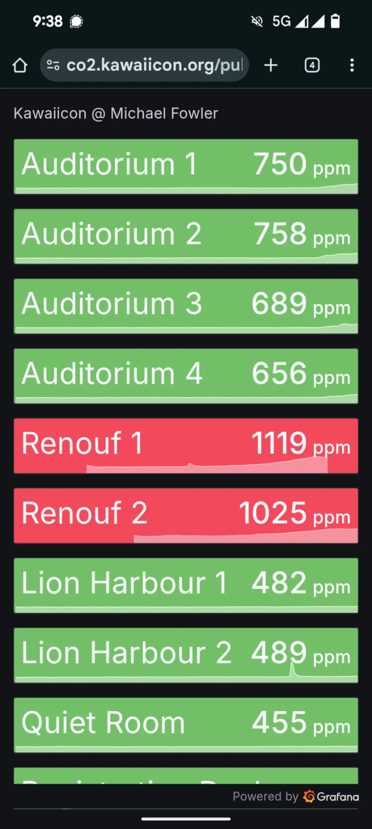 Elevated levels of CO2 lead to reduced cognitive ability and facilitate transmission of airborne viruses, which can linger in poorly ventilated spaces for hours. The more CO2 in the air, the more virus-friendly the air becomes, making CO2 data a handy proxy for tracing pathogens. In fact, the Australian Academy of Science described the pollution in indoor air as “someone else’s breath backwash.” Kawaiicon organizers faced running a large infosec event during a measles outbreak, as well as constantly rolling waves of Covid-19, influenza, and RSV. It’s a familiar pain point for conference organizers frustrated by massive gaps in public health—and lack of control over their venue’s clean air standards.
