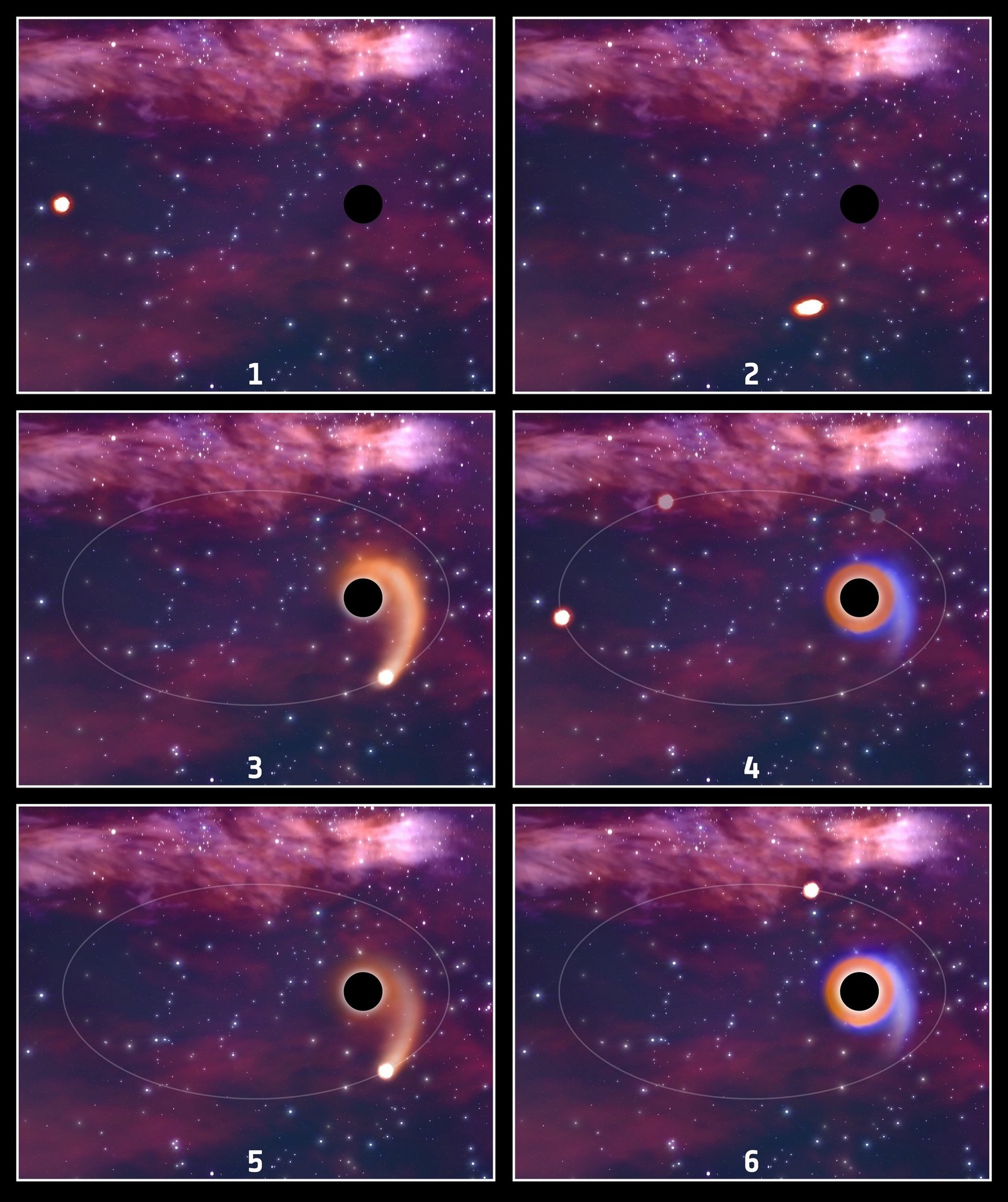 A six panel image showing how a star becomes stretched and ripped apart as it falls in a black hole