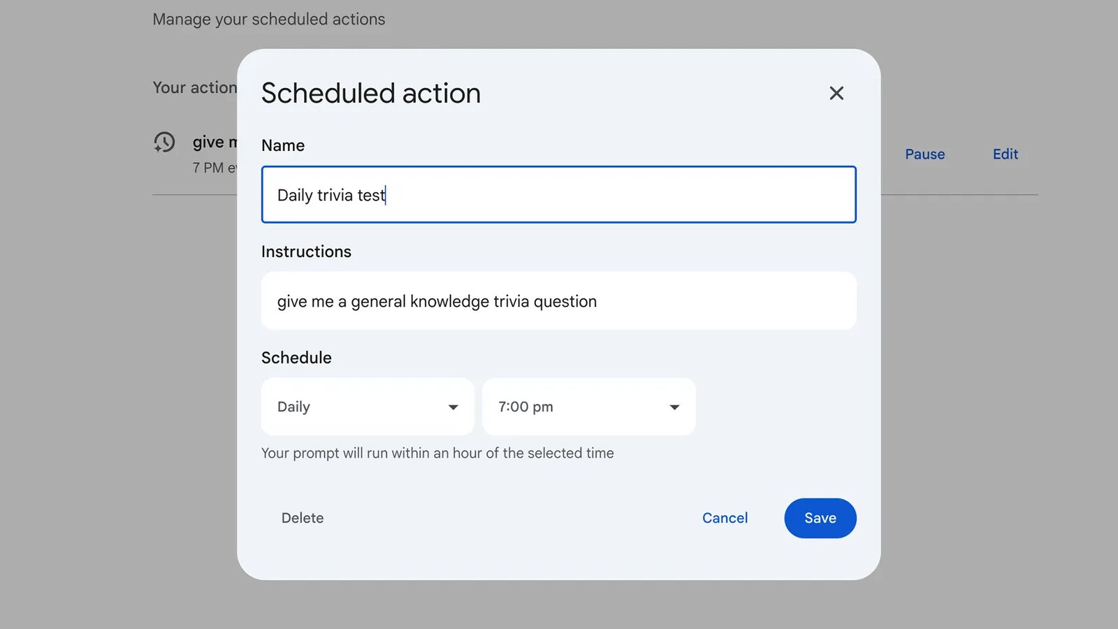 All you need to do to create a scheduled action in Gemini is to describe it, and include the scheduling details in the prompt. For example, you might tell Gemini to “generate an image of a cat playing with a ball of yarn, every Monday at 12 pm,” or “give me a general knowledge trivia question every evening at 7 pm.”