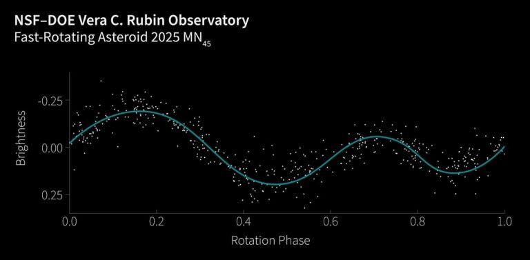 That said, 2025 MN45 is not the only fast spinner in the main asteroid belt. In addition to 2025 MN45, Rubin’s first dataset includes 16 “super-fast” rotators, each of which has a rotational period of between 13 minutes and 2.2 hours, as well as two “ultra-fast” rotators with spins of less than two minutes each. All of these asteroids are also longer than 100 yards (90 m), and all but one of the newfound asteroids lives in the main belt.