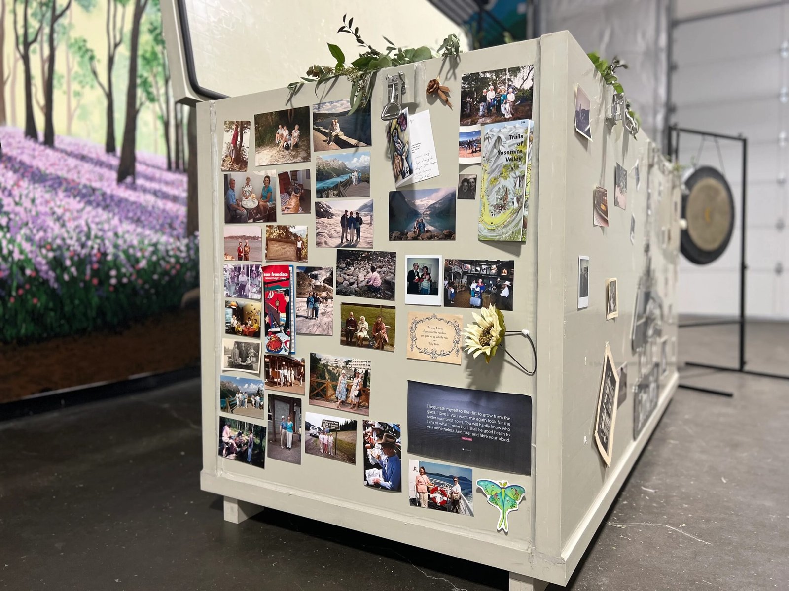 A photograph of a large, pale-gray, rectangular composting vessel. The side of the vessel is decorated with dozens of personal photos, postcards, and small mementos, attached with magnets. In the background on the left is a colorful mural depicting a forest with purple flowers, and a large metal gong is visible on a stand on the right. The floor is dark concrete.