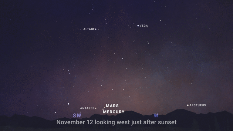 But you can see these two long distance pals close together if you look slightly southwest just after sunset in the early evening sky on November 12th.