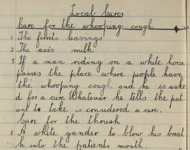 The children ended up collecting stories of folklife spanning 55 topics covering everything from how butter was churned to games to the devastating impacts of the Irish famine and sectarian violence. They wrote down these remedies in both Irish and English and gathered almost three-quarters of a million pages’ worth of documentation.